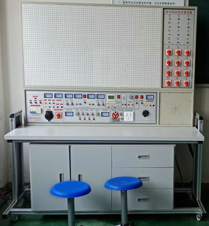 (一)實(shí)驗(yàn)桌:學(xué)生實(shí)驗(yàn)桌12張,一桌二座,實(shí)驗(yàn)桌外形尺寸為160×70×80cm。桌子中央配置九孔電路插板,電路板注塑而成,表面布有九孔成一組相互聯(lián)通的插孔,元件盒在其上任意拼插成實(shí)驗(yàn)電路。元件盒盒體透明直觀,內(nèi)裝電阻、電容、電感、二極管、三極管、場(chǎng)效應(yīng)管、可控硅等元件來(lái)完成原理實(shí)驗(yàn)。內(nèi)裝元件一目了然,盒蓋印有永不褪色元件符號(hào),線條清晰美觀。盒體與盒蓋采用較科學(xué)的壓卡式結(jié)構(gòu),維修、拆裝方便。繼電部分訓(xùn)練元器件已裝在特制的元件盒上,實(shí)訓(xùn)時(shí)插在九孔電路板上即可連線實(shí)驗(yàn),方便,靈活。模電、數(shù)電實(shí)訓(xùn)項(xiàng)目由二十幾套實(shí)訓(xùn)電路板和相應(yīng)元器件來(lái)完成。每張操作桌配有一粒膠皮板,保護(hù)通用電路板和桌面(如出需要在桌上放置電動(dòng)機(jī)、焊接等) 桌子下部是元器件儲(chǔ)存柜,放置實(shí)驗(yàn)元件、器材、工具等。