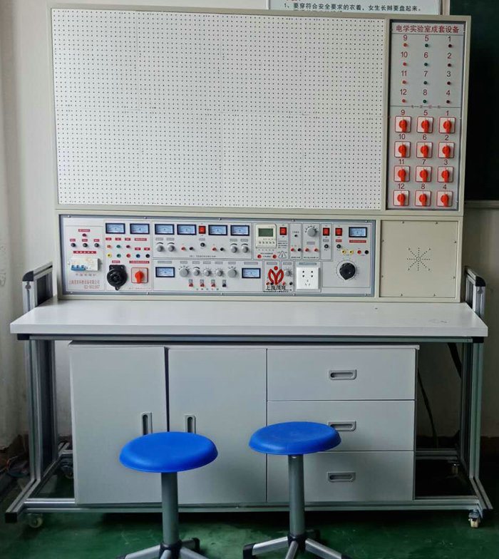 1、配有12臺學(xué)生實(shí)驗(yàn)桌,一臺二座,桌外形尺寸160×68×80cm,桌面中央配置通用插板,尺寸為90×35cm,桌下部是元件儲存柜。