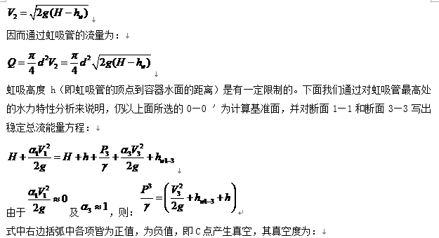由上式可以看出,虹吸管引流液體的能量來(lái)自虹吸管出口至容器內(nèi)水面間的位能(位置水頭)H,它的一部分用于克服虹吸管內(nèi)的阻力,即損失能量hw,另一部分用于轉(zhuǎn)變?yōu)榱魉偎^,以保證有一定的流量流出。由此可得虹吸管內(nèi)的斷面平均流速為: