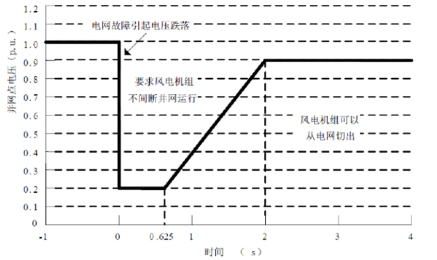 并網(wǎng)點(diǎn)電壓跌至20%額定電壓時(shí),保證不脫網(wǎng)連續(xù)運(yùn)行625ms ;