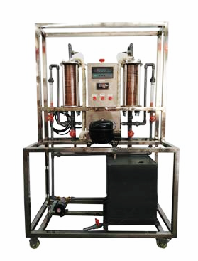 采用透明耐壓玻璃作殼體的壓縮機、盤管蒸發(fā)器、盤管冷凝器。循環(huán)水泵,玻璃轉子流量計,調節(jié)閥門組、PVC板冷卻水箱;測試系統(tǒng)由8路萬能信號輸入液晶顯示巡檢儀、PT100熱電偶組成;有工作臺架可隨時移動。