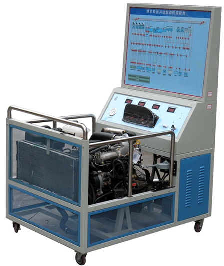 發(fā)動(dòng)機(jī)總成和發(fā)動(dòng)機(jī)控制單元、原車線束、儀表總成、冷卻液溫度傳感器、油軌壓力傳感器、曲軸位置傳感器、空氣流量計(jì)、點(diǎn)火開關(guān)、整套散熱機(jī)構(gòu)、汽油箱和汽油泵總成、蓄電池、五個(gè)數(shù)字電壓表、真空壓力表及燃油壓力表、帶有完整彩色電路原理圖面板、外接式檢測(cè)端子、智能故障設(shè)置盒總成、可移動(dòng)臺(tái)架、使用說(shuō)明書及實(shí)驗(yàn)指導(dǎo)書等。