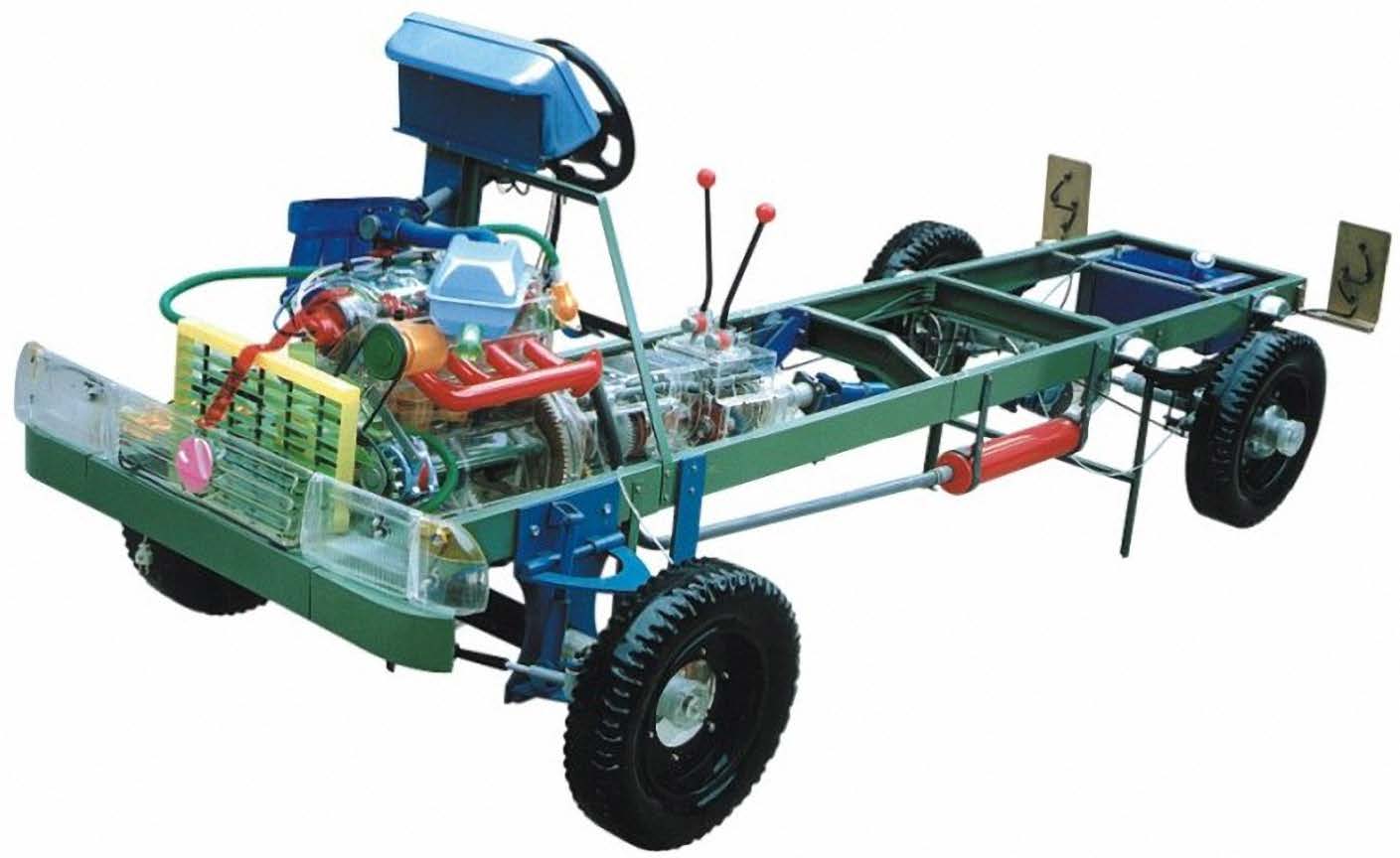 獵豹CJY6470型透明整車模型選用透明有機(jī)玻璃制作,部件均以硬質(zhì)工程塑料加工,利用螺絲固定在金屬高溫烘漆而成的車架上。各總成均以壓模成形加工,代替過去用膠水粘合的辦法,在牢固度上有很大的提高。發(fā)動機(jī)總成,以電力驅(qū)動,油門設(shè)有調(diào)速裝置,能演示發(fā)動機(jī)轉(zhuǎn)速的高低。離合器分離明顯,操縱靈活,離合器外殼整體壓模而成,變速器的各檔齒輪用各種顏色表示,操縱自如,其中主減速,差速,轉(zhuǎn)動靈活,車輪對開壓鑄,刻有防滑槽紋,美觀大方。轉(zhuǎn)向裝置以及電瓶、油箱、水箱,做工精細(xì)、富有光澤,制動管路分布清楚,一目了然。電路采用對插件前后分布,前燈架用透明有機(jī)玻璃壓模成整體,美觀逼真,儀表板及后燈架逼真堅(jiān)固。