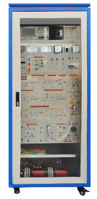 2、控制柜最上部為示波器放置區(qū)和設(shè)故箱,中間部分為電源控制部分,實(shí)訓(xùn)接線區(qū)和相應(yīng)的監(jiān)控儀表,裝有±300V直流電壓表、±2.0A直流電流表和數(shù)字轉(zhuǎn)速表用于指示直流電機(jī)的運(yùn)行狀態(tài),控制柜下部裝有三相同步變壓器、三相電流互感器和功率晶閘管模塊等。