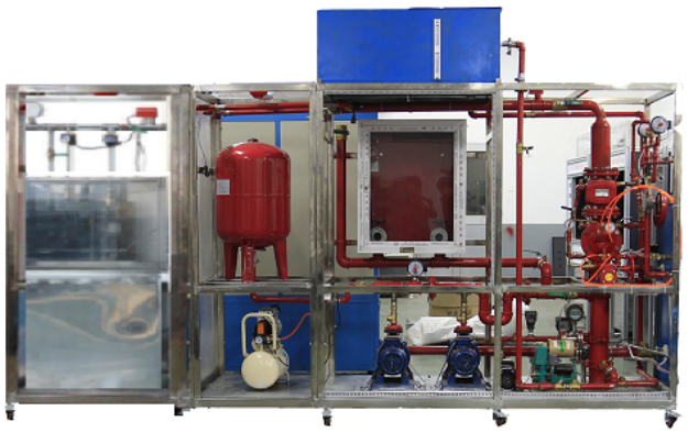該實訓(xùn)平臺有控制區(qū),消防供水池、高位水泵保護區(qū)域、等主要配備有預(yù)作用報警裝置、消防氣壓罐、消防火栓箱、消防栓、消防帶、消防水泵、高位水泵、備用泵、氣壓泵、感煙探測器、感溫探測器、自動充氣裝置、水流指示器、信號碟閥、壓力開關(guān)的狀態(tài)檢測,設(shè)有全透明護區(qū)域、具有火災(zāi)模擬演示等。