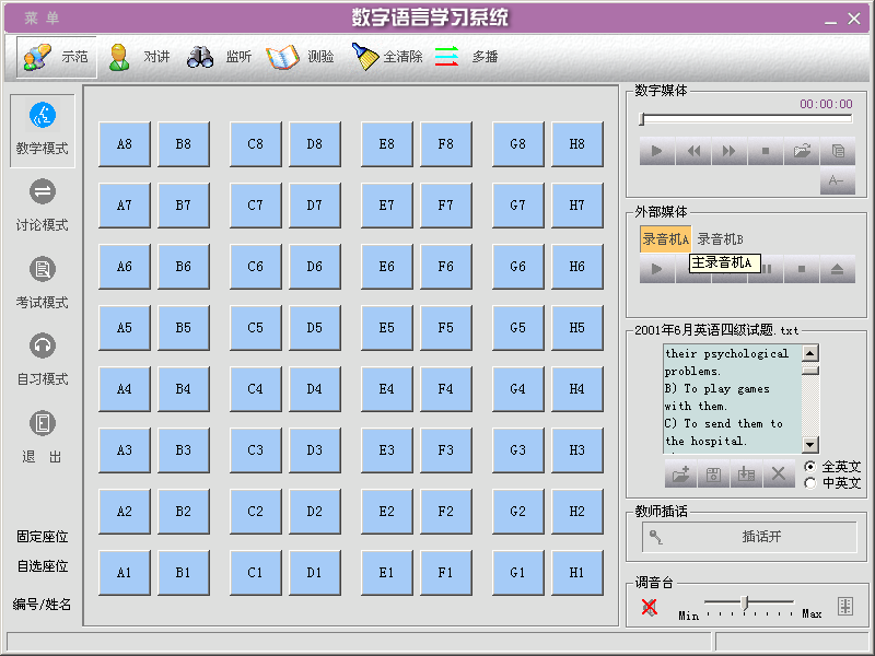 最多支持8套節(jié)目同時(shí)廣播,可以任意選擇學(xué)生收聽(tīng)指定節(jié)目。豐富齊全的語(yǔ)言素材庫(kù)素材庫(kù)豐富齊全,存儲(chǔ)量大,隨系統(tǒng)已贈(zèng)送相當(dāng)于幾百盤(pán)磁帶地學(xué)習(xí)資料。避免了教師頻繁更換磁帶,反復(fù)機(jī)械操作地?zé)⿶,與傳統(tǒng)語(yǔ)音室相比,又節(jié)約了大筆開(kāi)支。本系統(tǒng)的資料來(lái)源廣泛,可從Internet網(wǎng)上下載,或從電腦光盤(pán)、錄音機(jī)磁帶上轉(zhuǎn)載,教師或?qū)W生可根據(jù)實(shí)際情況,選擇同等級(jí)的其它英語(yǔ)資料,廣泛地進(jìn)行學(xué)習(xí),達(dá)到真正掌握地目的。動(dòng)態(tài)設(shè)定學(xué)生點(diǎn)播范圍。由于點(diǎn)播資料庫(kù)內(nèi)容廣泛,包括課堂教材、科技、時(shí)事、文化、乃至休閑資料。教師有時(shí)需要讓學(xué)生有針對(duì)性的補(bǔ)充課外知識(shí),若是完全開(kāi)放,就有失初衷。若是能在資料庫(kù)目錄中設(shè)定學(xué)生可以點(diǎn)播的范圍,這種情況就能有效控制。