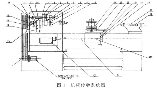 主軸的旋轉(zhuǎn)運(yùn)動(dòng),從主電機(jī)經(jīng)皮帶輪l-2傳動(dòng)頭箱1軸,由齒輪4-5、6-7、7-10嚙合,及17-16、7-10嚙合,變換雙速電機(jī)使主軸獲得4種正轉(zhuǎn)高速。