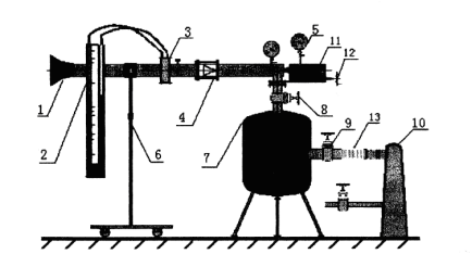 1-入口段 2-U型管壓差計 3-孔板流量計 4-噴管試驗段 5-真空表6-支撐架 7-穩(wěn)壓罐 8、9-調(diào)節(jié)閥 10-真空泵 11-探針自動移動機構(gòu) 12-探針手動移動機構(gòu)(手槍) 13-橡膠接管