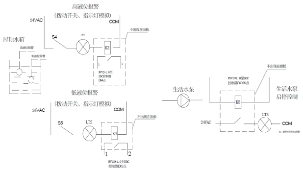 | LT2 | 生活水箱高液位指示燈 | S2 | 風(fēng)機(jī)手動(dòng)運(yùn)行撥動(dòng)開關(guān)(二位) |