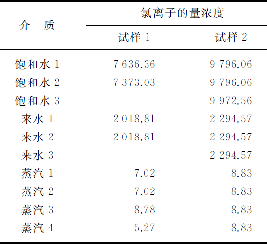 蒸汽狀態(tài)的水不含有氯離子,通過(guò)化驗(yàn)飽和水及蒸汽中的氯離子的量濃度,可以得出汽中液態(tài)水的量濃度,氯離子化驗(yàn)結(jié)果見(jiàn)表1所列。