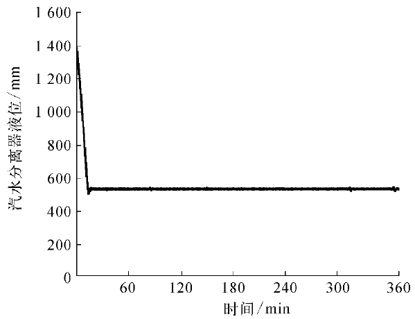 汽水分離器分離效果的好壞更多地反應(yīng)在氣路是否含液上,只要保證液位控制在設(shè)計(jì)區(qū)間,即可保證液中不含氣體。分離器的液位設(shè)計(jì)高度為325~675mm,裝置平穩(wěn)工作后,分離器的平均液位一直保持在525mm左右,只有在壓力調(diào)節(jié)時(shí)會(huì)發(fā)生少量波動(dòng),滿足了設(shè)計(jì)要求,可以保證水中沒(méi)有氣體。汽水分離器的液位趨勢(shì)變化如圖3所示。