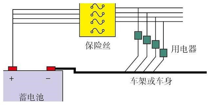 單線連接是汽車線路最大的特點(diǎn)。汽車上的用電設(shè)備都是并聯(lián)的,從理論上講需要一根公共的火線和一根公共的零線。而汽車發(fā)動(dòng)機(jī)和底盤是由金屬制造的,具有良好的導(dǎo)電性能。因此,利用汽車的金屬機(jī)體作為各種用電設(shè)備的公共導(dǎo)線,而用電設(shè)備到電源就只需用一根導(dǎo)線連接,所以稱為單線制。