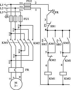 二、接觸器聯(lián)鎖的三相異步電動機(jī)正反轉(zhuǎn)控制線路實驗電路圖:
