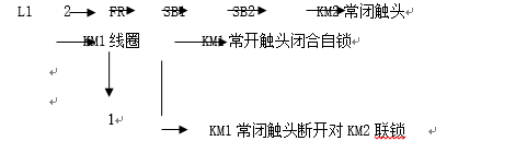 (2)反轉(zhuǎn)控制  要使電動機(jī)改變轉(zhuǎn)向(即由正轉(zhuǎn)變?yōu)榉崔D(zhuǎn))時,應(yīng)先按下停止按鈕SB1,使正轉(zhuǎn)控制電路斷開,電動機(jī)停轉(zhuǎn),然后才能使電動機(jī)反轉(zhuǎn),為什么要這樣操作呢?因為反轉(zhuǎn)控制回路中串聯(lián)了正轉(zhuǎn)接觸器KM1的常閉觸頭。當(dāng)KM1通電工作時,它是斷開的,若這時直接按反轉(zhuǎn)按鈕SB3,反轉(zhuǎn)接觸器KM2是無法通電的,電動機(jī)也就得不到電源,故電動機(jī)仍然處在正轉(zhuǎn)狀態(tài),不會反轉(zhuǎn),當(dāng)先按下停止按鈕SB1,使電動機(jī)停轉(zhuǎn)以后,再按下反轉(zhuǎn)按鈕SB3,電動機(jī)才會反轉(zhuǎn)。這時,反轉(zhuǎn)控制線路為: