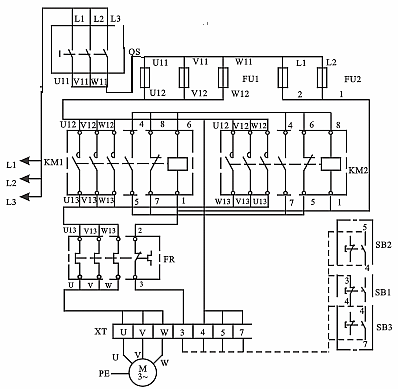 仔細(xì)檢查確認(rèn)接線無誤后,接通交流電源,按下SB2,電機(jī)應(yīng)正轉(zhuǎn)(電機(jī)右側(cè)的軸伸端為順時針轉(zhuǎn),若不符合轉(zhuǎn)向要求,可停機(jī),換接電機(jī)定子繞組任意兩個接線即可)。按下SB3,電機(jī)仍應(yīng)正轉(zhuǎn)。如要電機(jī)反轉(zhuǎn),應(yīng)先按SB1,使電機(jī)停轉(zhuǎn),然后再按SB3,則電機(jī)反轉(zhuǎn)。若不能正常工作,則應(yīng)分析并排除故障,使線路能正常工作。