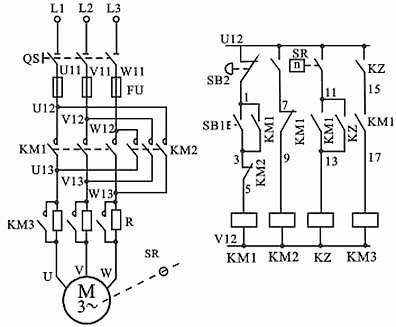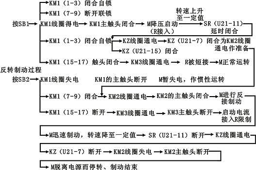 圖中KM1為正轉運行接觸器,KM2為反接制動接觸器,用點劃線和電動機M相連的SR,表示速度繼電器SR與M同軸,動作過程分析如下: