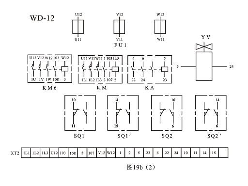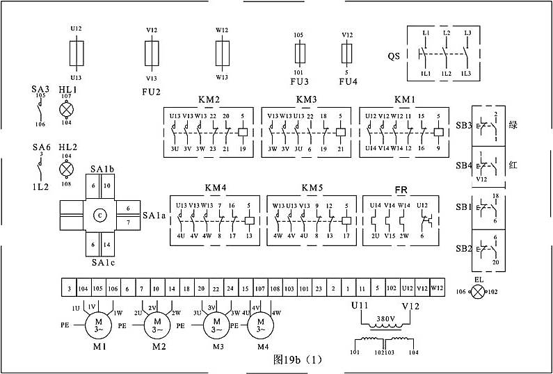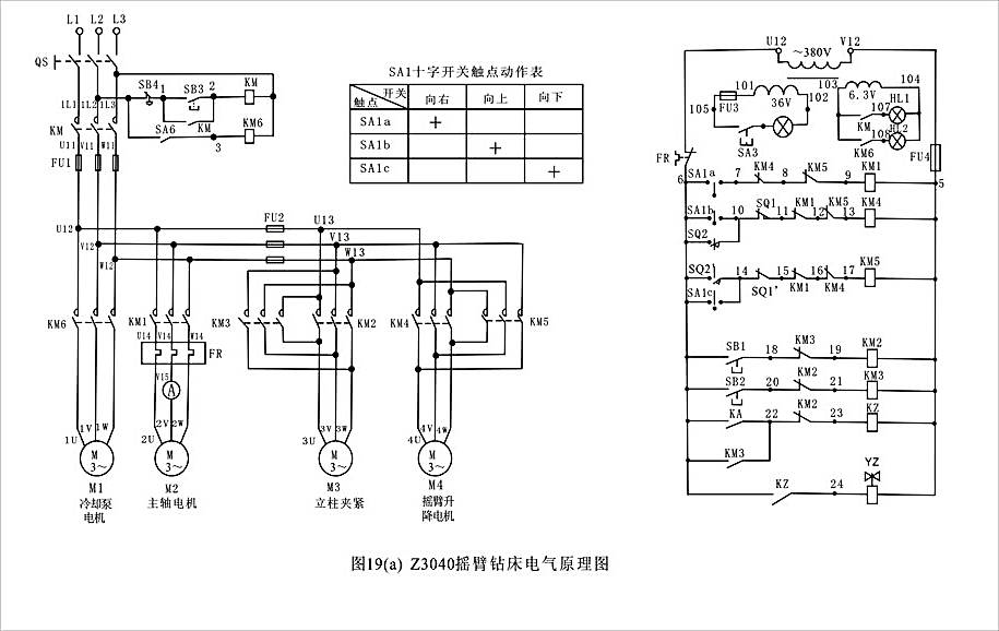 (1) 主電路分析  本機(jī)床的電源開關(guān)采用接觸器KM,具有零壓保護(hù)和欠壓保護(hù)作用。從圖19(a)中可看出,搖臂鉆床共有四臺(tái)電動(dòng)機(jī)。主電動(dòng)機(jī)M2由主接觸器KM1控制,單向旋轉(zhuǎn),主軸正反轉(zhuǎn)由機(jī)械手柄操作。電動(dòng)機(jī)M3是立柱放松和夾緊電動(dòng)機(jī)。用接觸器KM2和KM3控制。M4是搖臂升降電動(dòng)機(jī),用接觸器KM4和KM5控制。M1是冷卻泵電動(dòng)機(jī)。