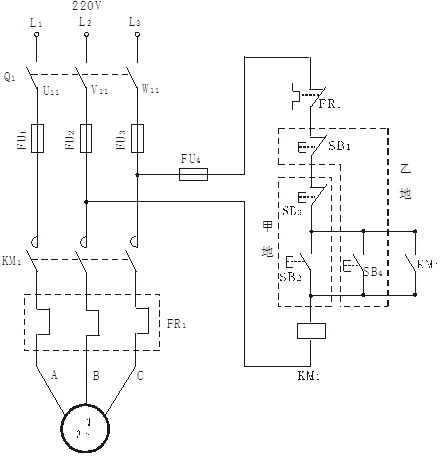 在確保斷電情況下按圖7-12接線。圖中SB1、SB2、SB3、FR1、KM1、FR1選用編號為DQ39的掛件,Q1、FU1、FU2、FU3、FU4、SB4選用編號為DQ39-1的掛件,電機選用DQ10(△/220V)。