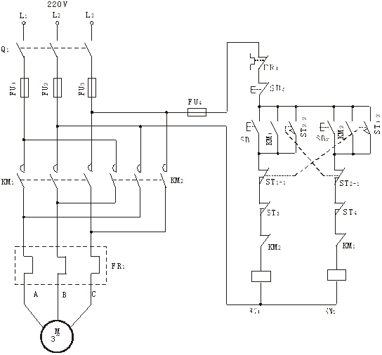 2斷電釋放,電動機停電釋放,電動機停轉(zhuǎn);同時常開觸點ST
