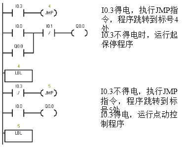 設(shè)I0.3為點(diǎn)動(dòng)/連動(dòng)控制選擇開(kāi)關(guān),當(dāng)I0.3得電時(shí),選擇點(diǎn)動(dòng)控制;當(dāng)I0.3不得電時(shí),選擇連續(xù)運(yùn)行控制。采用跳轉(zhuǎn)指令控制的點(diǎn)動(dòng)/連動(dòng)控制程序如下圖所示