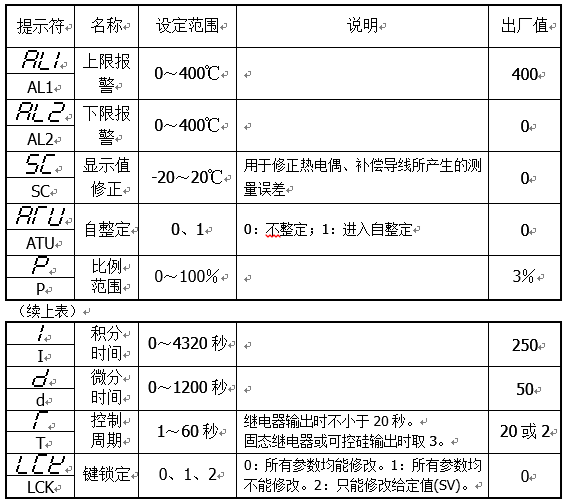 3、控制參數(shù)的設(shè)定:按SET鍵5秒鐘以上,PV窗口顯示控制參數(shù)的提示符(詳見控制參數(shù)一覽表),配合鍵,使SV窗口顯示為所需要的值。繼續(xù)按SET鍵,PV窗口依次顯示各參數(shù)的提示符,可以繼續(xù)設(shè)定其他的參數(shù),再按SET鍵5秒鐘以上,回到標(biāo)準(zhǔn)模式(無鍵按下30秒鐘后自動(dòng)返回到標(biāo)準(zhǔn)模式)。