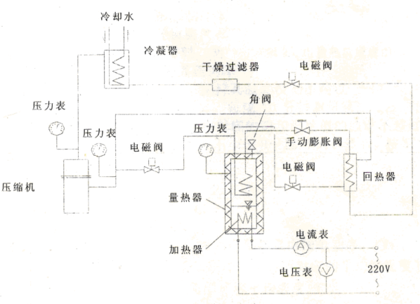 測定壓縮機制冷系統(tǒng)制冷量的實驗臺,如圖1所示,由電量熱器、制冷系統(tǒng)、水系統(tǒng)三部分組成。