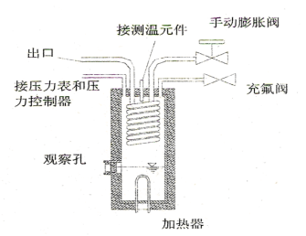 為了控制第二制冷劑的液面,在電量熱器的中間部位裝有觀察玻璃孔。電量熱器上裝有壓力控制器,它與電加熱器的控制電路相連接,防止壓縮機停機后加熱器繼續(xù)加熱,使量熱器內(nèi)壓力升高到危險程度。