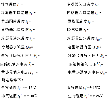 (6)工況穩(wěn)定后,觀察并記錄實驗數(shù)據(jù),測定該工況下的吸氣壓力、排氣壓力、電量熱器內(nèi)壓力、吸氣溫度、排氣溫度、冷凝器入口溫度、冷凝器出口溫度、回熱器入口溫度、節(jié)流閥前溫度、電量熱器出口溫度、電量熱器氣體溫度、電量熱器輸入電流和電壓、壓縮機輸入電流和電壓、冷卻水流量、冷卻水入口溫度、冷卻水出口溫度。
