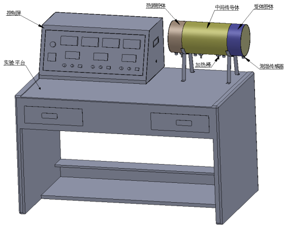 由可移動(dòng)實(shí)驗(yàn)臺(tái)、絕熱腔體、溫度傳感器、熱源、傳導(dǎo)體、受體等組成。