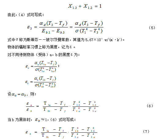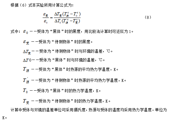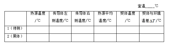 本實(shí)驗(yàn)儀器用比較法定性地測(cè)定物體的黑度,具體方法是通過改變?nèi)M加熱源溫度(熱源一組,傳導(dǎo)體二組),使熱源和傳導(dǎo)體的測(cè)量點(diǎn)穩(wěn)定在同一溫度上,然后分別測(cè)出“待測(cè)物體”和“黑體”兩種受體在恒溫條件下受到輻射后的溫度,再根據(jù)公式計(jì)算出“待測(cè)物體”的黑度。