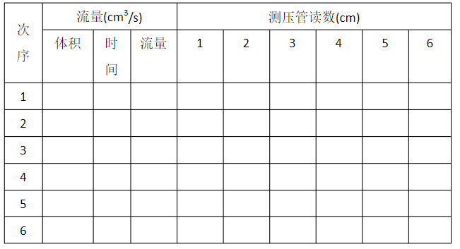 3.打開(kāi)流量調(diào)節(jié)閥12至最大開(kāi)度,如果測(cè)壓管讀數(shù)超出測(cè)量范圍時(shí),應(yīng)適當(dāng)關(guān)小流量調(diào)節(jié)閥12,待流量穩(wěn)定后,測(cè)記測(cè)壓管讀數(shù),同時(shí)用體積法或重量法測(cè)定流量。