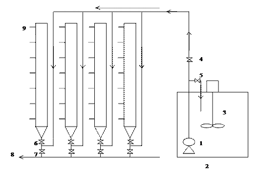1、水泵 2、配水箱 3、攪拌裝置 4、配水管閥門 5、水泵循環(huán)管閥門 6、各沉淀柱進(jìn)水閥門 7、各沉淀柱放空閥門 8、排水管 9、取樣口