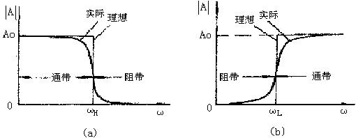 低通濾波電路:其幅頻響應(yīng)如圖3-2(a)所示,圖中A0表示低頻增益|A|的幅值。由圖可知,它的功能是通過從零到某一截止角頻率ωH 的低頻信號,而對大于ωH的所有頻率完全衰減,因此其帶寬BW=ωH 。