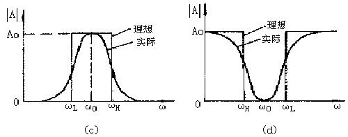 帶阻濾波電路:其幅頻響應(yīng)如圖3-2(d)所示,由圖可知,它有兩個通帶:在0<ω<ωH和ω>ωL,和一個阻帶:ωH<ω<ωL。因此它的功能是衰減ωL到ωH間的信號。同高通濾波電路相似,由于受有源器件帶寬的限制,通帶ω>ωL也是有限的。