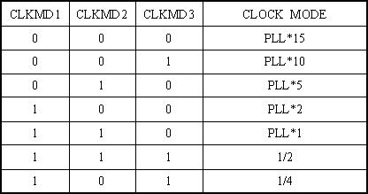 2.定時器是對c5402的主時鐘CLKOUT進行分頻的。CLKOUT與外部晶體振蕩器頻率(在本實驗系統(tǒng)中外部晶體振蒎器的頻率為16.384MHz)之間的關(guān)系的c5402的三個引腳CLKMD1、CLKMD2、CLKMD3的電平值決定,具體關(guān)系如表18-1所示: