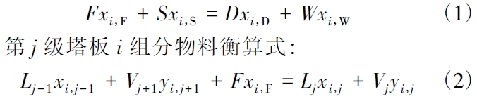 式中:F、S、D 和W 分別為進(jìn)料量、萃取劑量、精餾塔頂采出量和塔底采出量,kg /h; Lj和Vj分別為第j 塊塔板的液相和氣相流量,kg /h;xi,j和為yi,j分別是第j 塊塔板或j 類(lèi)液相和氣相中i 組分的質(zhì)量分率;當(dāng)j 為非進(jìn)料級(jí)時(shí),F(xiàn)=0。