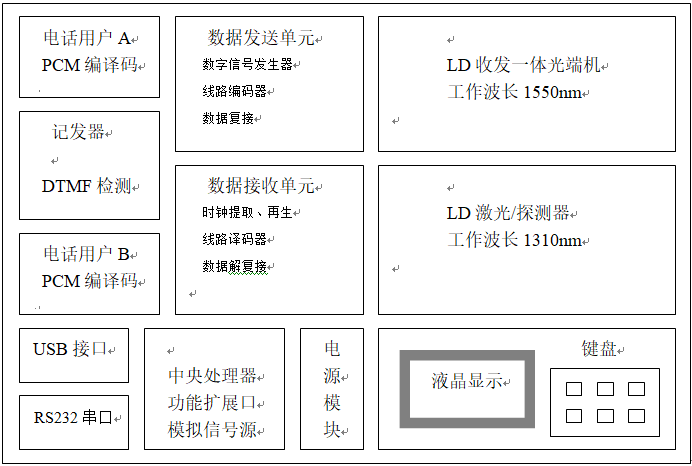 本實(shí)驗(yàn)系統(tǒng)可分為電端機(jī)模塊、光通信模塊、管理控制模塊、電源供給模塊等四大功能模塊,每個(gè)功能模塊又是由許多子模塊組成: