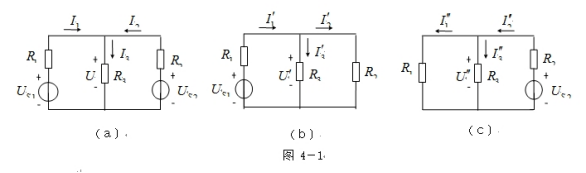 疊加原理指出:在有幾個電源共同作用下的線性電路中,通過每一個元件的電流或其兩端的電壓,可以看成是由每一個電源單獨作用時在該元件上所產(chǎn)生的電流或電壓的代數(shù)和。具體方法是:一個電源單獨作用時,其它的電源必須去掉(電壓源短路,電流源開路);在求電流或電壓的代數(shù)和時,當(dāng)電源單獨作用時電流或電壓的參考方向與共同作用時的參考方向一致時,符號取正,否則取負(fù)。在圖4-1中: