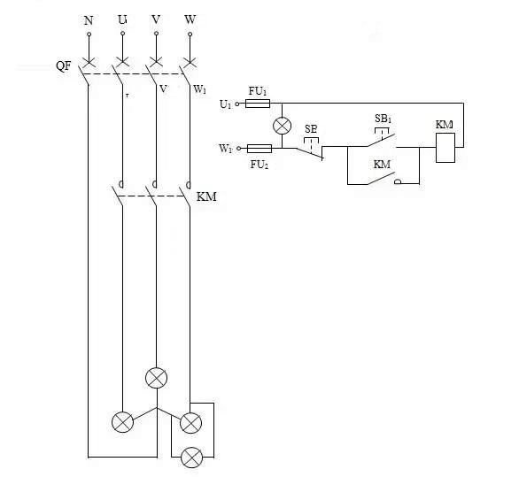 從W1相考慮接斷路器FU2 FU2的小組出線接常閉按鍵SB SB的小組出線線接開與關(guān)按鍵SB1 SB1的小組出線線接交流接觸器電磁線圈KM KM的小組出線線接斷路器FU1 FU1的小組出線線接U1相。將鎖緊KM開與關(guān)并在開與關(guān)按鍵SB一兩端。最終接顯示燈。